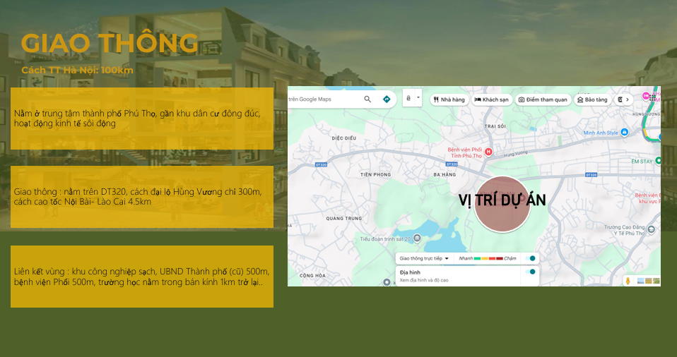 - VỊ TRÍ- Nằm trong cách trung tâm Phú Thọ cũ chỉ 500m- Cách đại lộ trung tâm chỉ 300m, đường cao tốc Nội Bài- Lào