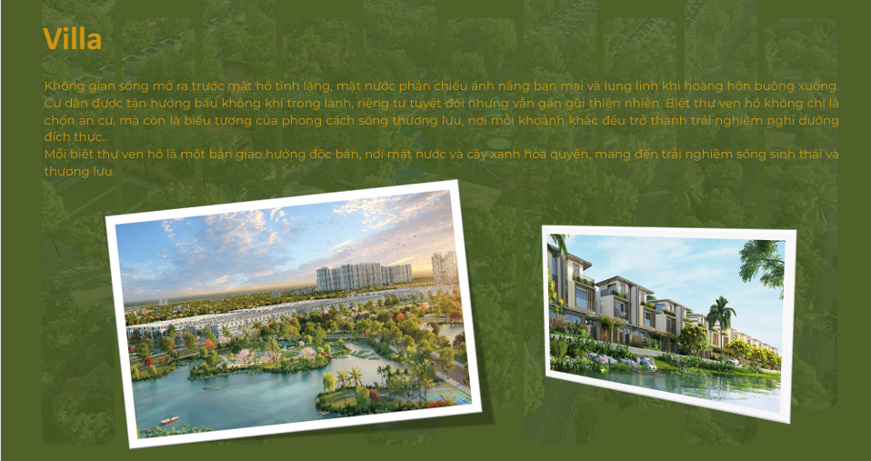 Thiết Kế Villa Phú Thọ Center Park Không gian sống mở ra trước mặt hồ tĩnh lặng, mặt nước phản chiếu ánh nắng ban mai và lung linh khi hoàng hôn buông xuống. Cư dân được tận hưởng bầu không khí trong lành, riêng tư tuyệt đối nhưng vẫn gần gũi thiên nhiên. Biệt thự ven hồ không chỉ là chốn an cư, mà còn là biểu tượng của phong cách sống thượng lưu, nơi mỗi khoảnh khắc đều trở thành trải nghiệm nghỉ dưỡng đích thực. Mỗi biệt thự ven hồ là một bản giao hưởng độc bản, nơi mặt nước và cây xanhhòa quyện, mang đến trải nghiệmsống sinh thái và thượng lưu.